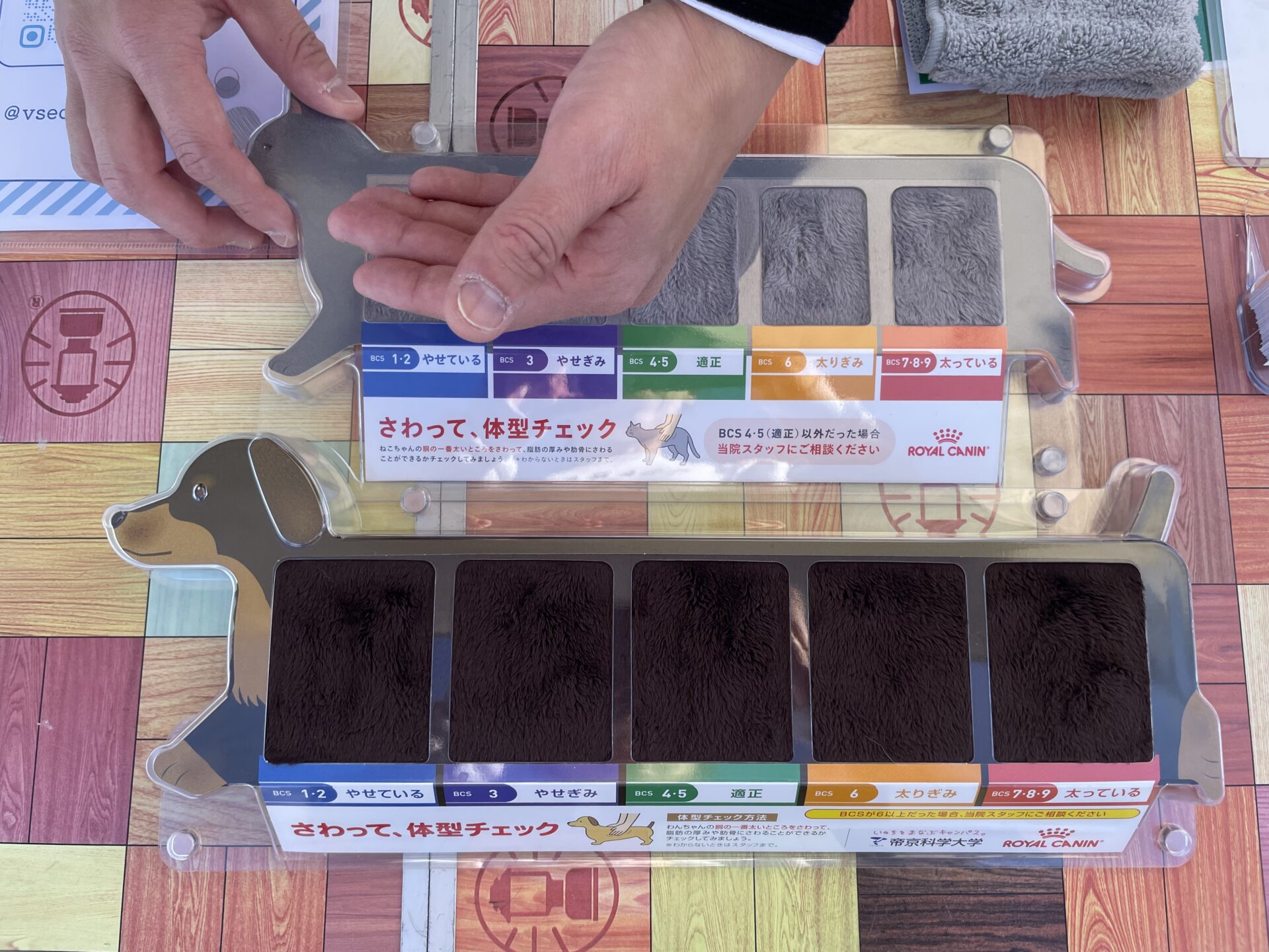 ボディコンディション(BCS)チェックコーナーは、太りすぎ/痩せすぎの目安をその場で確認し、適正体型の考え方を共有するもの。自分の愛犬(猫)が痩せているのか太っているのかを“触って確かめられる”体験ツール(写真)を使いながら、スタッフが来場者に丁寧に説明していました。