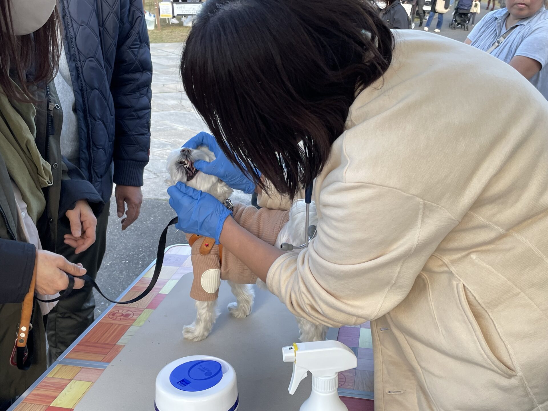 愛犬用のフードや洋服、お出かけグッズなどのブースが立ち並ぶ中、どうぶつの総合病院ブースでは、獣医師・愛玩動物看護師による簡易健康チェックをメインに、愛犬の健康にまつわる体験を提供していました。