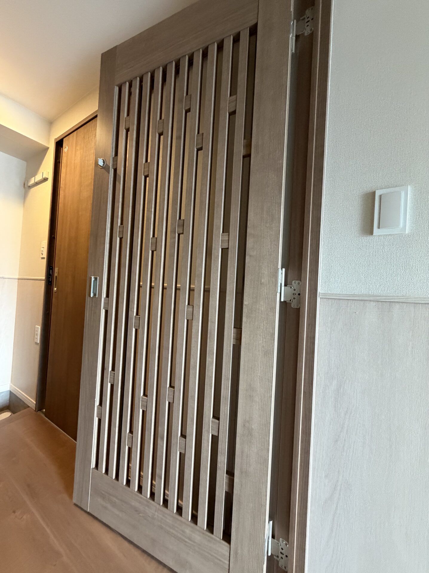 玄関には、猫の飛び出しを防ぐためのキャットゲートが設置されています。しかしここでも、単なる安全装置にとどめていない点が印象的です。