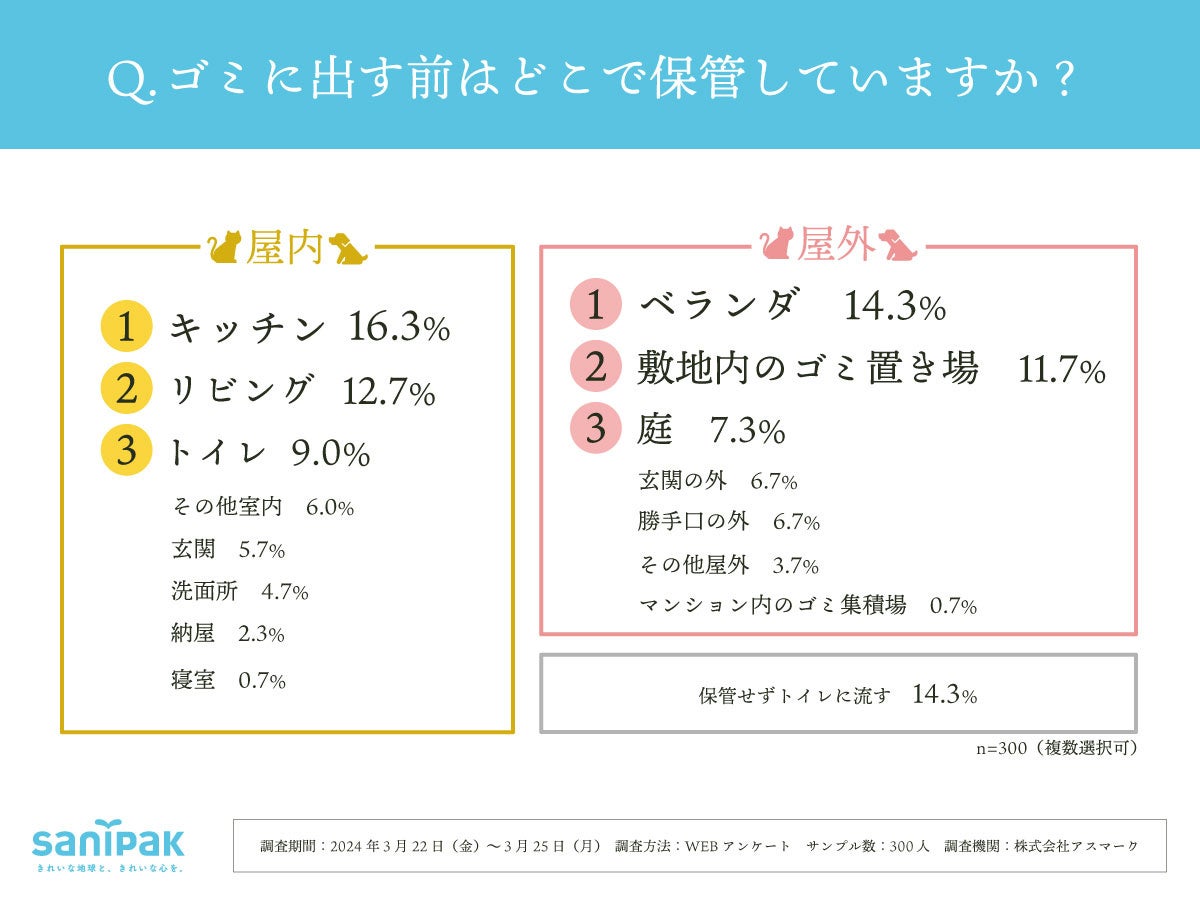 屋外も同じく専用のゴミ箱を用意されている方が多いですが、数値を見ると屋内で保管をされており、蓋をすることでニオイ対策をされている方が多いと分かります。