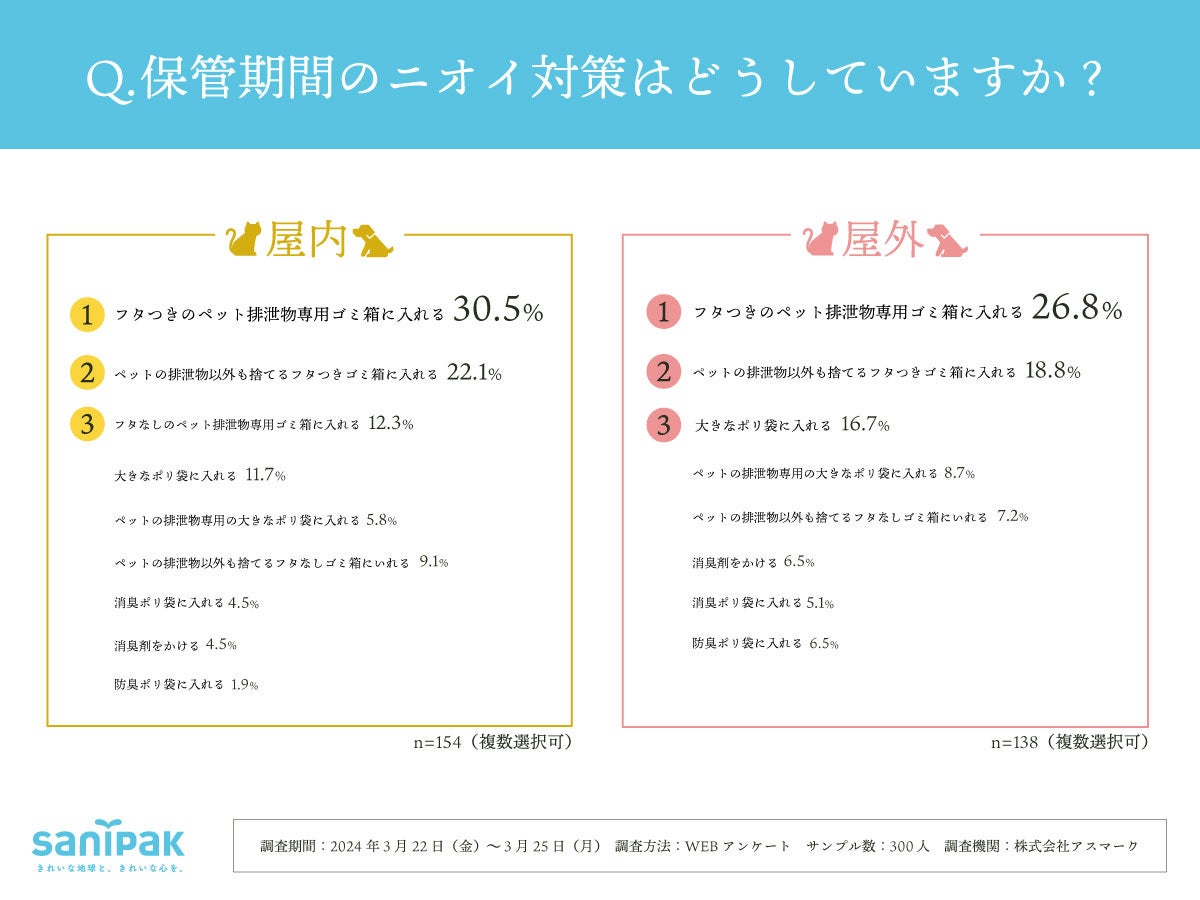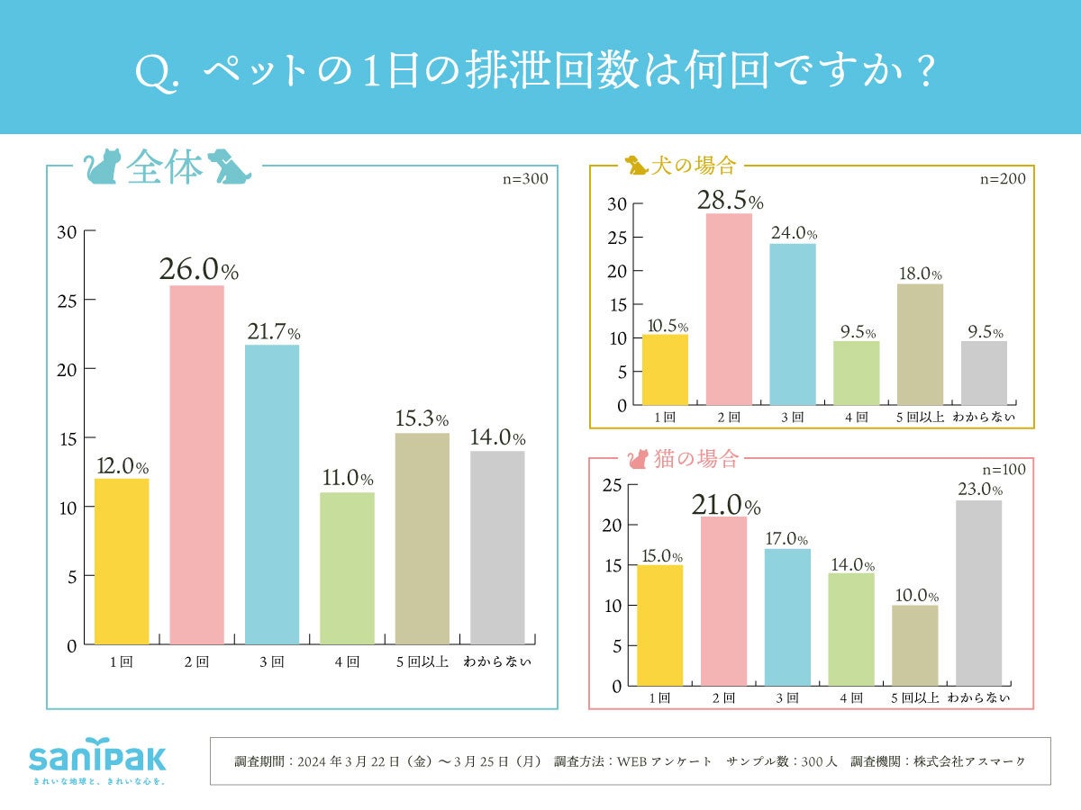 日本サニパック株式会社(本社:東京都渋谷区、代表取締役社長:井上充治、以下 サニパック)は全国のペット(犬・猫)を飼っている20~69歳の男女に、飼育中切っても切り離せない「排泄物処理」に関するアンケート調査を実施いたしました。