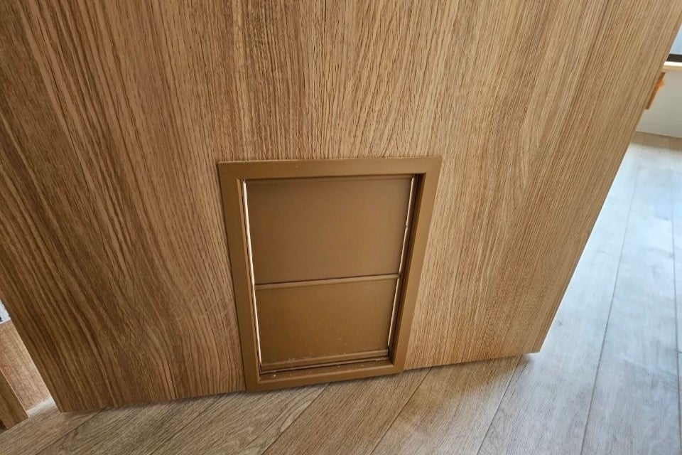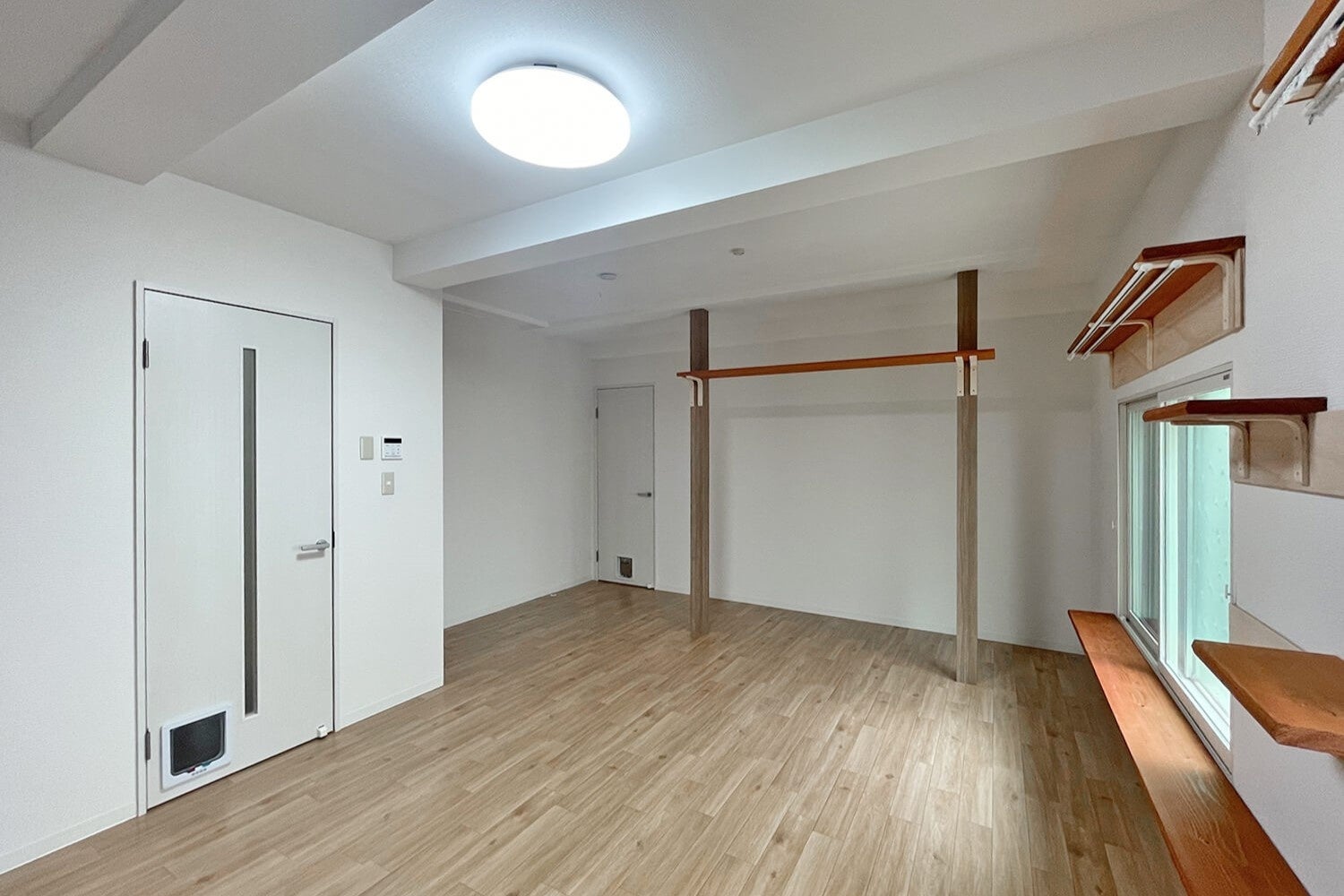 部屋の扉を閉めていても猫達が居室間を移動できるペットドアや戸外への飛び出し対策として玄関手前の扉設置など…自由気ままな猫が安全で快適に暮せるよう、その空き家の状況に合わせて臨機応変に設計対応しています。空き家再生のプロである当社の腕の見せどころです。