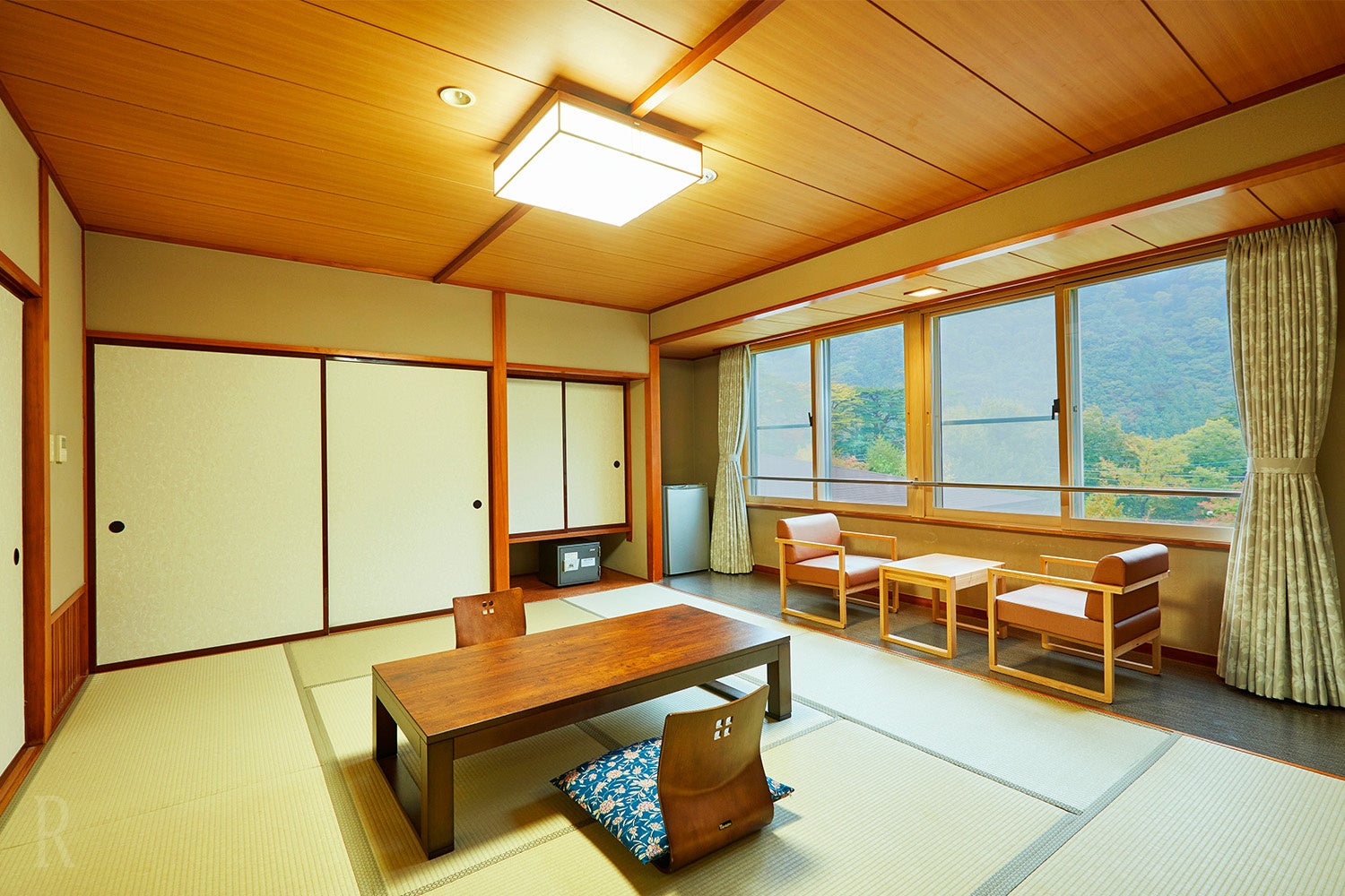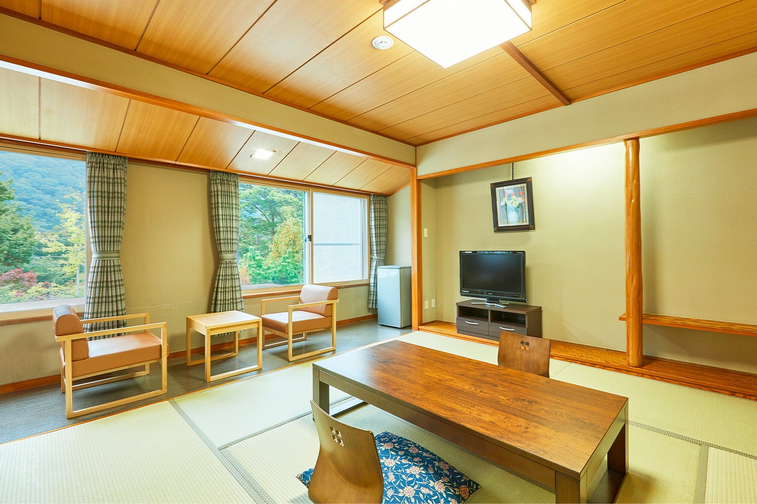 和室や洋室、露天風呂付きの特別客室など、広さやスタイルに応じた6タイプのお部屋からお選びいただけます。さらに、バリアフリー対応客室も完備しており、車椅子をご利用の方も安心してご滞在いただけます。自然に囲まれた落ち着いた雰囲気の中、愛犬と共に快適で癒しのひとときをお楽しみください。