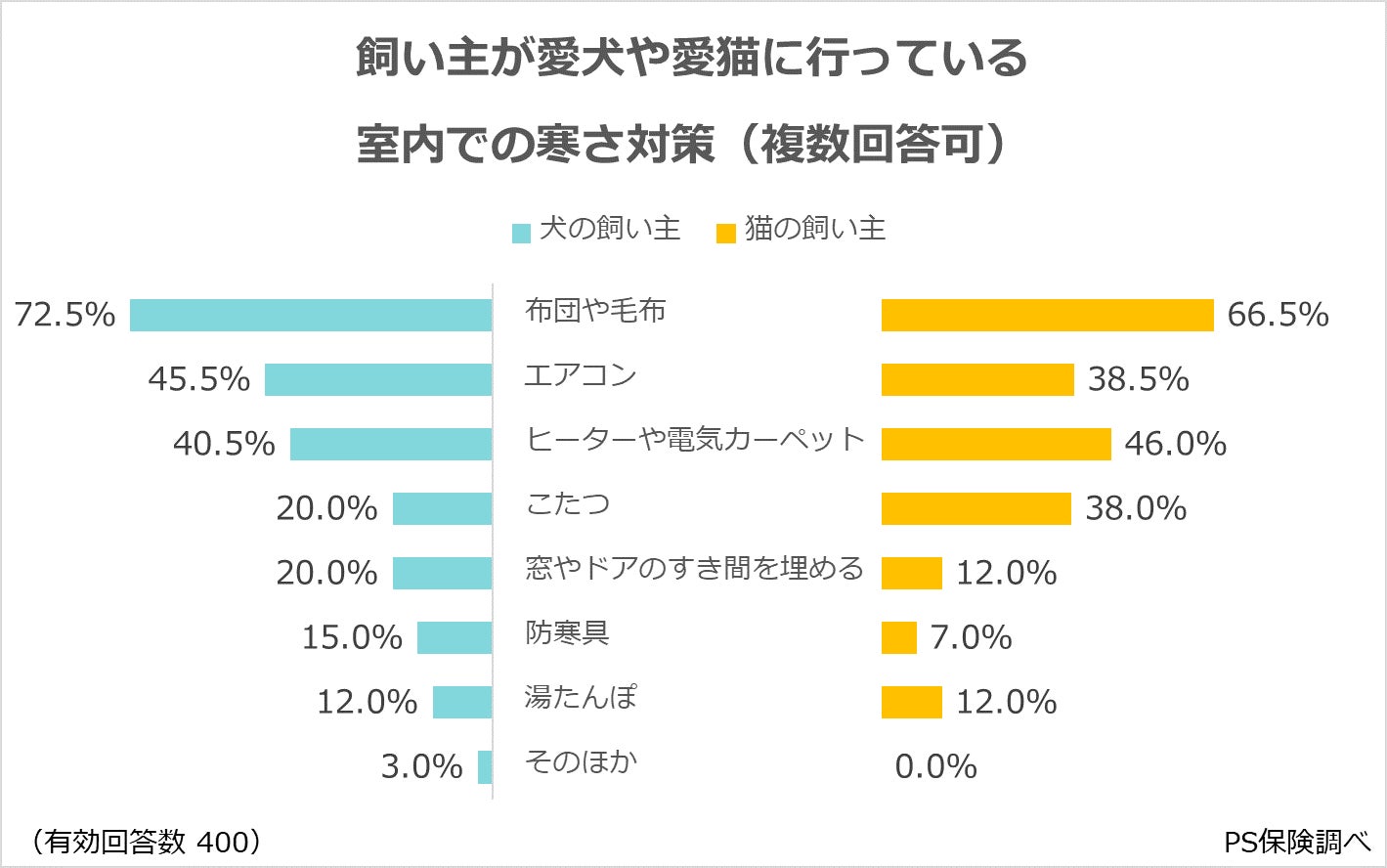 犬の飼い主の場合、「布団や毛布」(72.5%)が最多でした。次いで、「エアコン」(45.5%)、「ヒーターや電気カーペット」(40.5%)と、直接的な暖かさを提供する暖房機器が使われています。「こたつ」(20.0%)も暖房機器ですが、これらに及びません。なお、「エアコン」は部屋全体を暖めるのに適しており、この利用率は猫の飼い主を上回ります。このほか、「窓やドアのすき間を埋める」(20.0%)や「防寒具」(15.0%)、「湯たんぽ」(12.0%)も一部の飼い主によって使われていますが、これらの割合は比較的少ないことがわかりました。