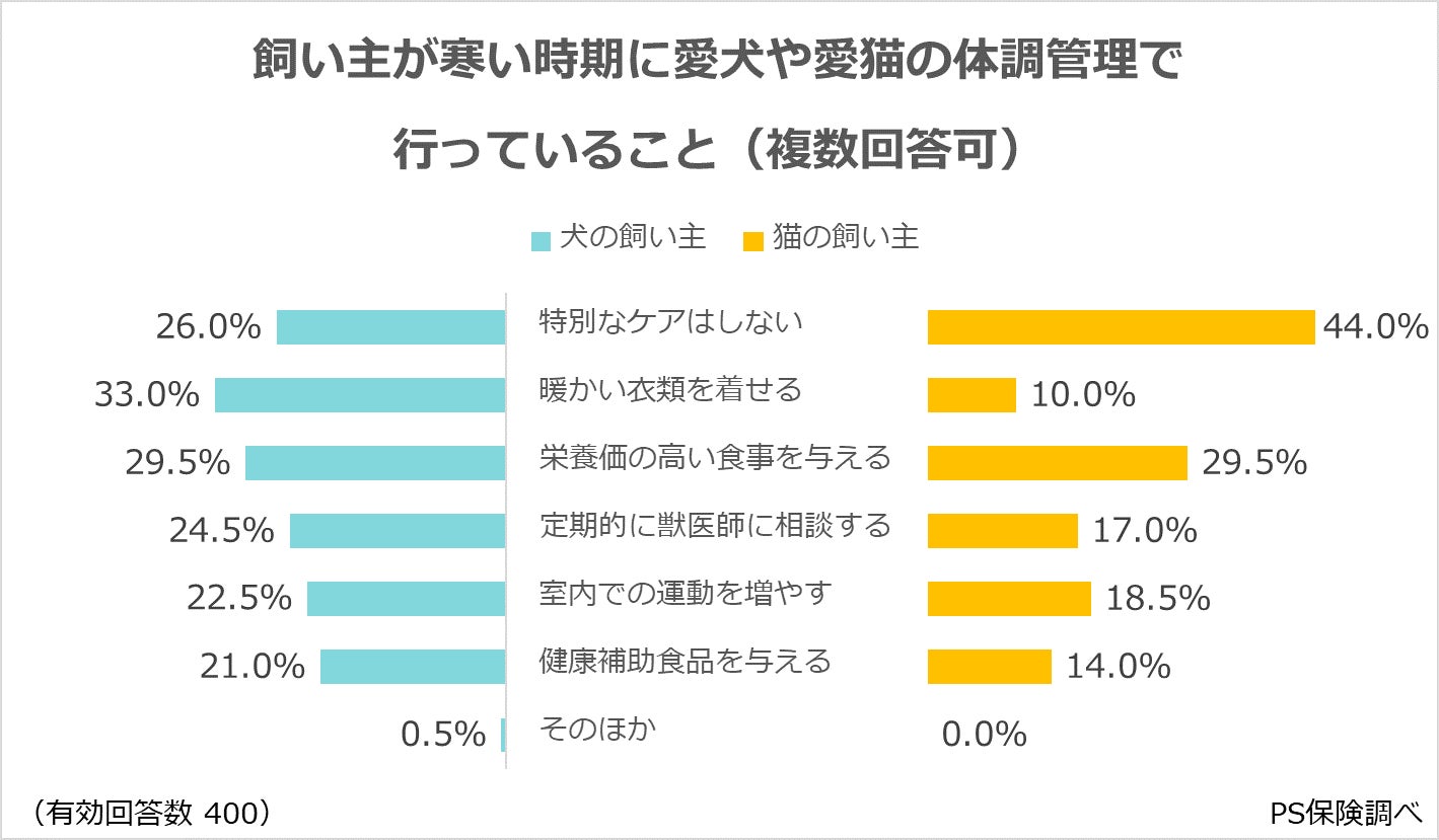 ・寒い時期に愛犬の体調管理で行っている対策は、「暖かい衣類を着せる」が最多。愛猫の場合は「特にケアはしない」。