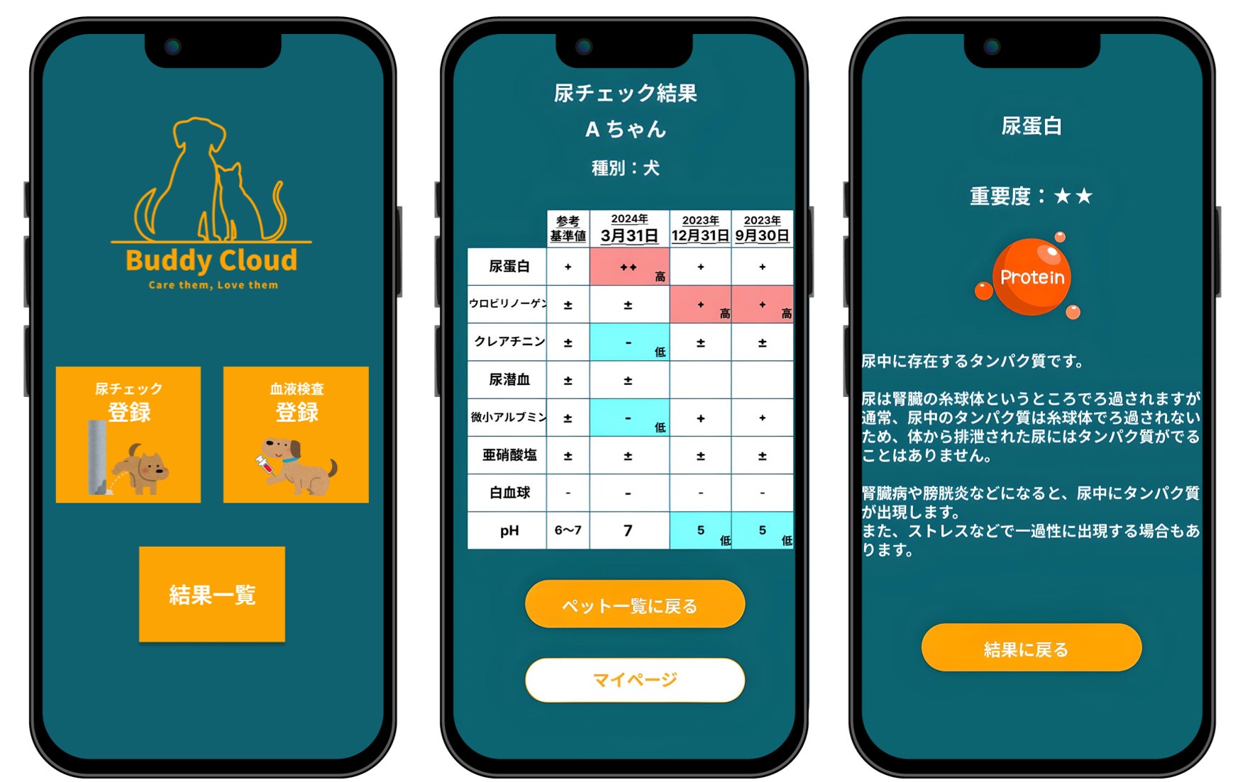 「Buddy Cloud」は、LINE上で簡単に利用できる愛犬・愛猫向けの健康管理サービスです。自宅で行う尿検査や動物病院の血液検査結果をデジタルで管理し、各検査項目の解説も提供します。このサービスを利用することで、ペットの健康状態を手軽にモニタリングでき、体調不良を早期発見し、後悔のないペットライフを実現します。