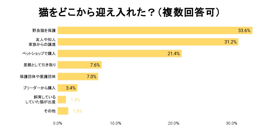 飼い主が猫を迎え入れる方法で最も多かったのは「野良猫を保護」(33.6%)、次いで「友人や知人、家族からの譲渡」(31.2%)でした。
