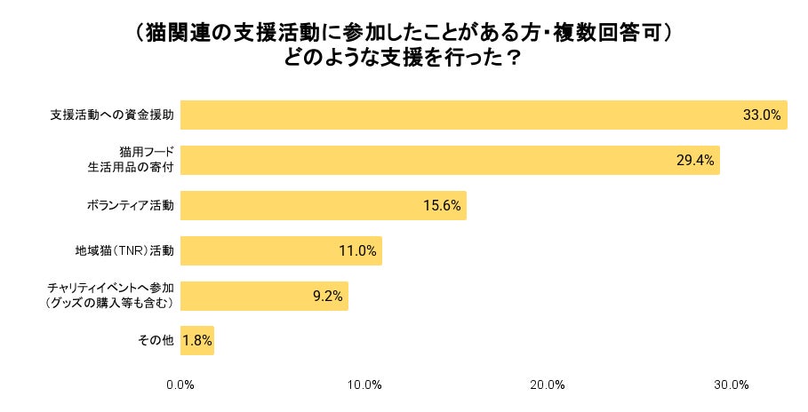 猫関連の支援活動に参加したことがある方へどのような支援を行ったかをを伺ったところ、「支援活動への資金援助」(33.0%)や「猫用フード・生活用品の寄付」(29.4%)の回答が多く挙がりました。