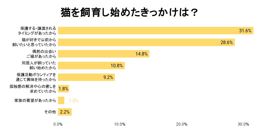 猫を飼育し始めたきっかけは、「保護する・譲渡されるタイミングがあったから」が31.6%、「保護活動・ボランティアを通じて興味を持ったから」が9.2%と、保護や譲渡がきっかけとなった方が4割以上を占めました。