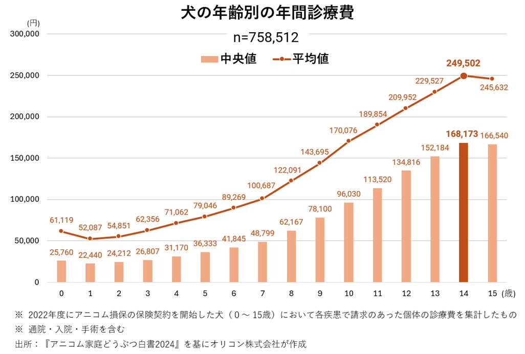 また、犬の年齢別の年間診療費は7歳で平均値100,687円と約10万円を超え、14歳では最高額の平均値24万9,502円、中央値16万8,173円となっています。