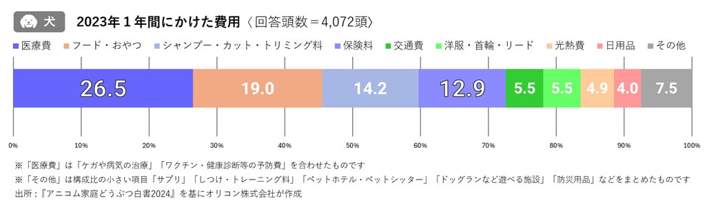 アニコムホールディングス株式会社が2024年12月19日に発行した『アニコム家庭どうぶつ白書2024』によると、2023年の1年間にペットにかけた費用の割合は犬の場合、「医療費」※が26.5%と全体の1/4を占めています。また、保険料は12.9%とシャンプー・カット・トリミングの14.2%と近い割