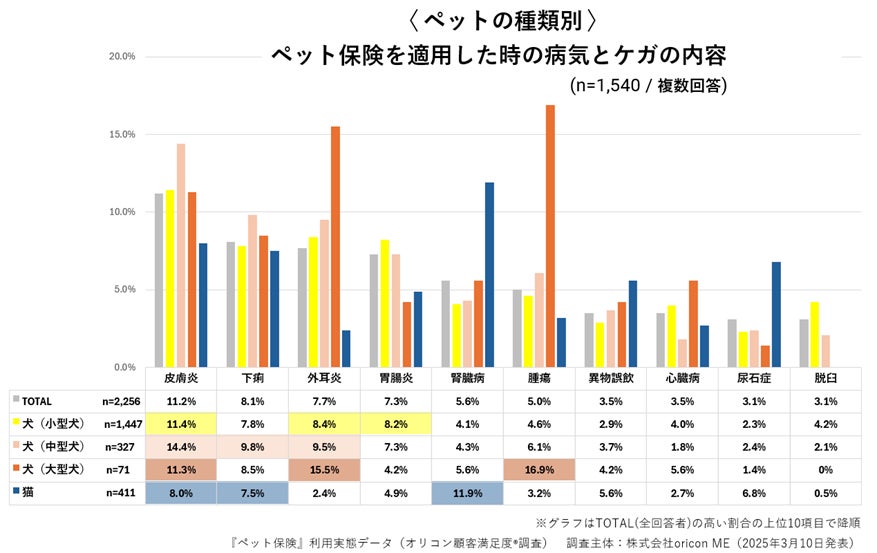 「小型犬」「中型犬」では「皮膚炎」が最多 「猫」では「腎臓病」が11.9%で最多