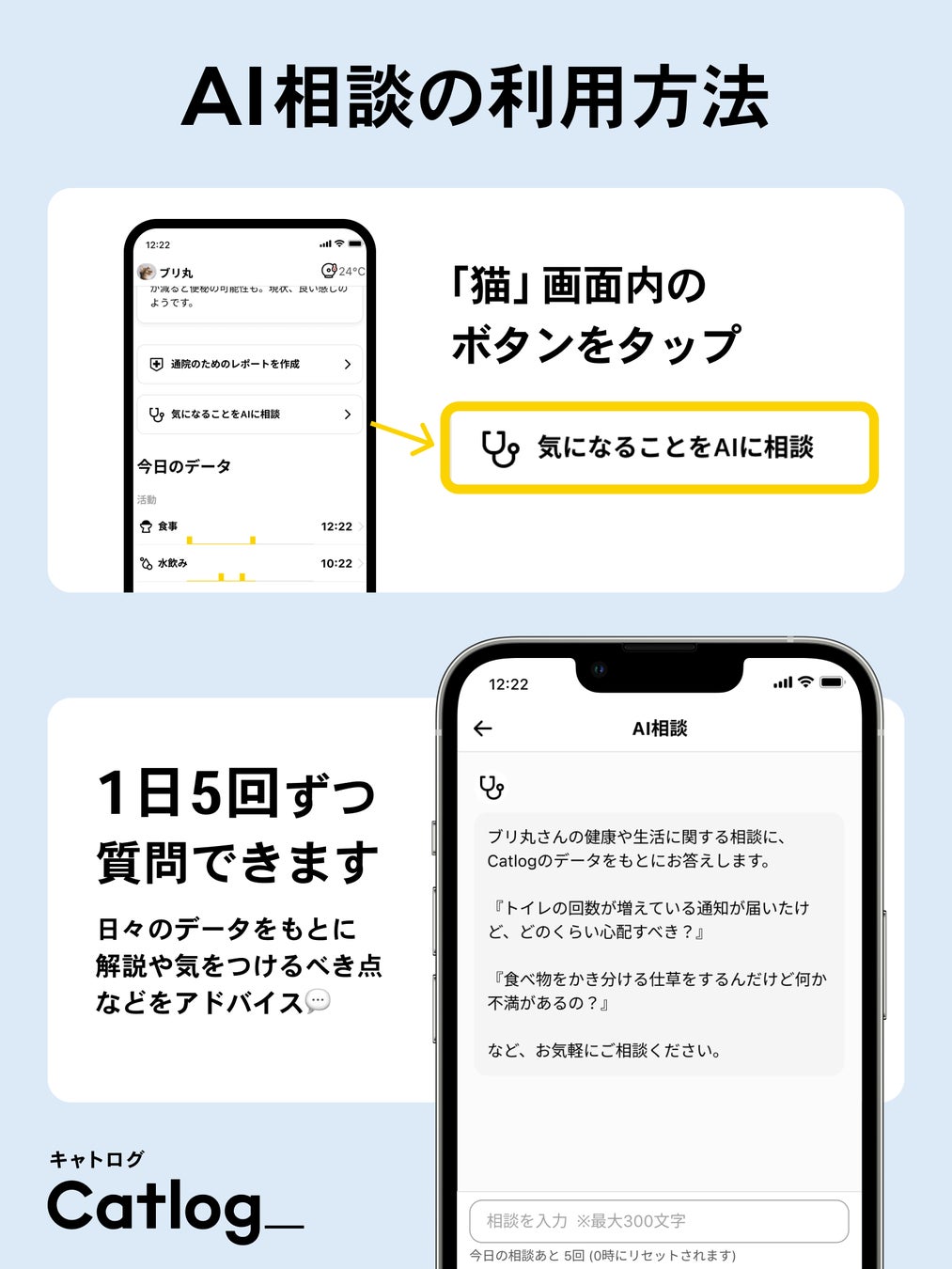 『Catlog』のAI相談機能は、Catlogアプリの「猫」画面から簡単にアクセスできます。質問は300文字以内で入力でき、1日に5回まで相談可能です。質問を送信すると、『Catlog』が収集した直近の行動データも合わせて分析され、総合的な視点からの回答が得られます。