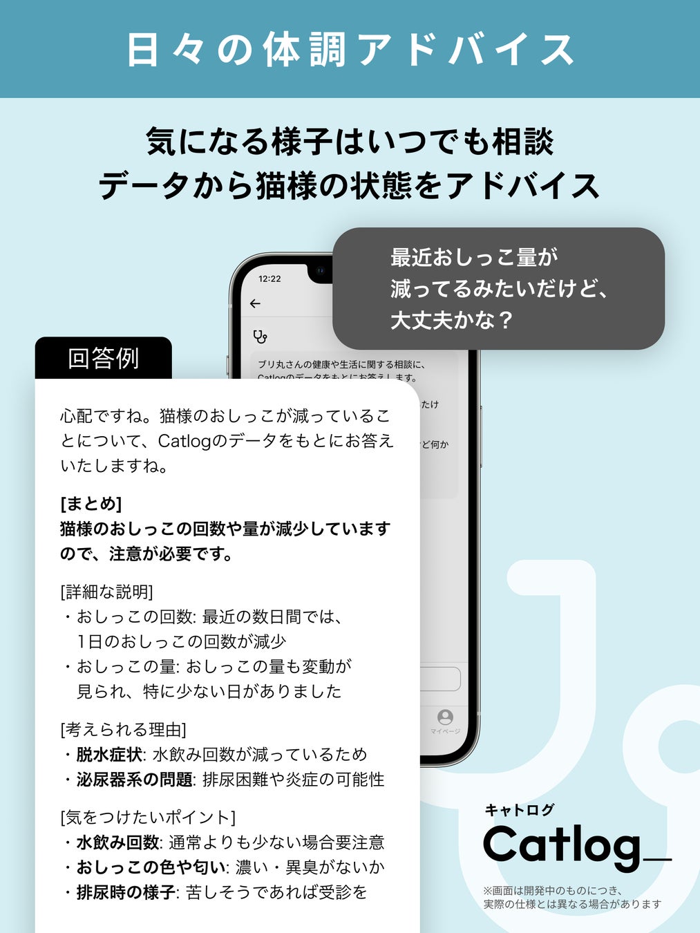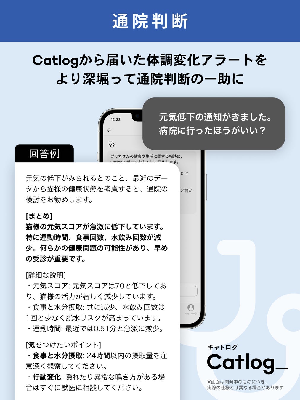 普段から外出する習慣がない猫様が多く、特に通院となると猫様や飼い主さんの負担も大きくなることもあるため、「今、病院につれていくべきかどうか。」と悩まれる飼い主さんは少なくありません。一方で、実際に通院してみるとすでに病状が進んでいるなど、飼い主さんはもちろん獣医師側の後悔も多く課題感として存在していると認識しています。近年、人医療においても医療DX普及が進んでいるなかで、農水省より動物医療におけるオンライン診療に関する指針も発表されており(参考:愛玩動物におけるオンライン診療の適切な実施に関する指針について https://www.maff.go.jp/j/syouan/tikusui/zyui/pet_telehealth.html)、獣医療DXは急速に拡大することが予想されています。このような流れを受け、RABOならではの方法で猫様と飼い主さんを支えるべく、獣医師の監修のもと開発し、日々のCatlogデータをもととした当機能にて、飼い主さんの通院判断をサポートします。24時間いつでも相談できるから、ちょっとした不安がすぐに解消。今後も、RABOは、猫様と飼い主様にとって、1秒でも長く一緒にいられるためにテクノロジーで見守る世界を目指してまいります。