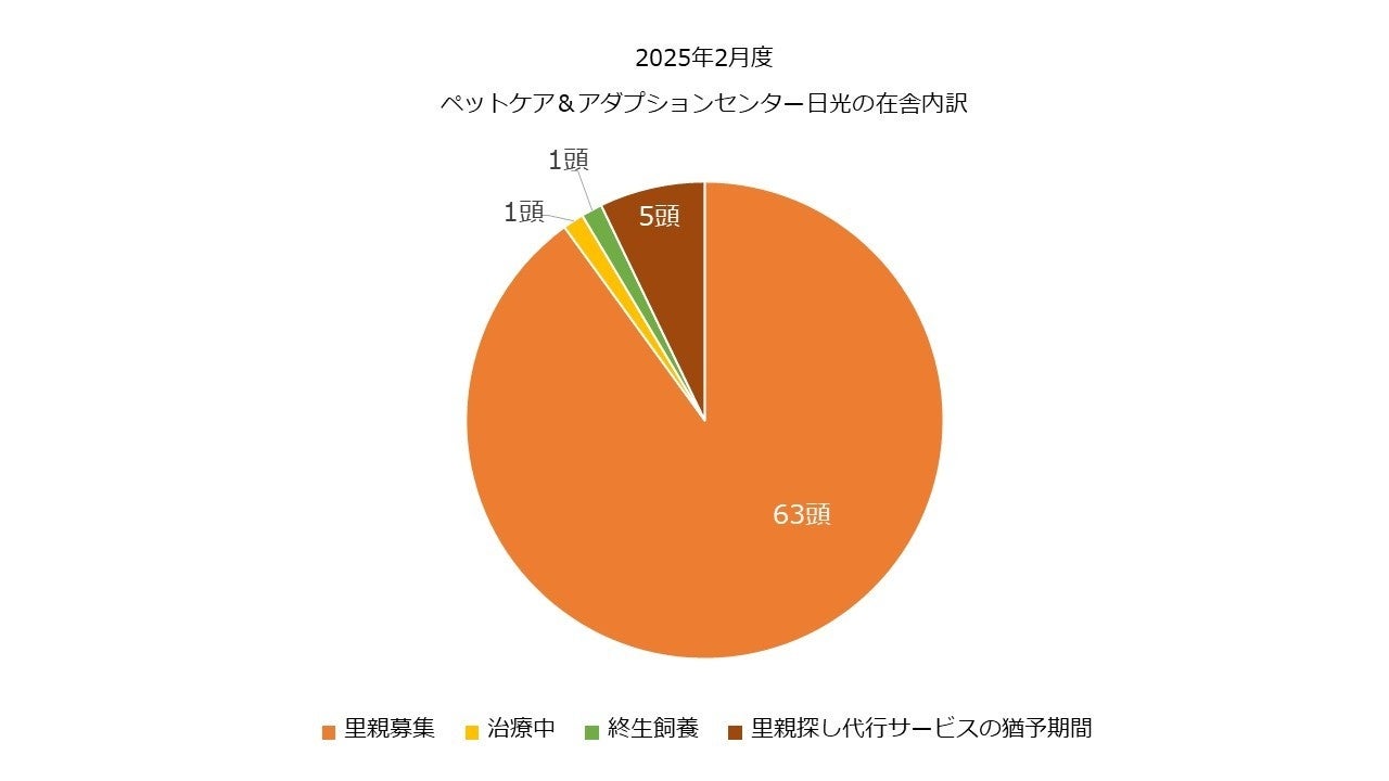 現在、ペットケア&アダプションセンター日光には2025年2月末時点で70頭が生活し、主に治療を終えた、または回復期にある63頭が⾥親を募集中です。なお、5頭は里親探し代行サービスの猶予期間中のため募集待ち、1頭は治療中、1頭は終生飼養を行う予定です。