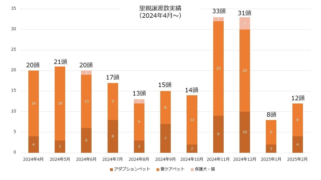 活動開始から着実に譲渡を積み重ね、2020年には累計譲渡数1,000頭に到達し、累計での譲渡数は1,285頭(2025年2月末時点)となりました。直近での譲渡数推移は以下のようになっており、2025年2月度の譲渡頭数は12頭(要ケアペット8頭、保護犬・猫0頭、アダプションペット4頭)となっております。