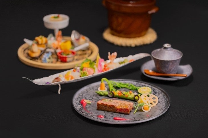 館内1階に配置する、8室の個室を備えた全13卓52席のダイニングでは、愛犬とともに夕食・朝食をお楽しみいただけます。夕食には、ゆったりと美食を堪能できる「モダン懐石」を提供し、愛犬用の食事も別途料金でご用意可能です。また、朝食は、和洋いずれかをお好みでお選びいただけるほか、4月から11月にかけては、テラス席で自然豊かな箱根の空気を肌で感じながらお召し上がりいただけます。