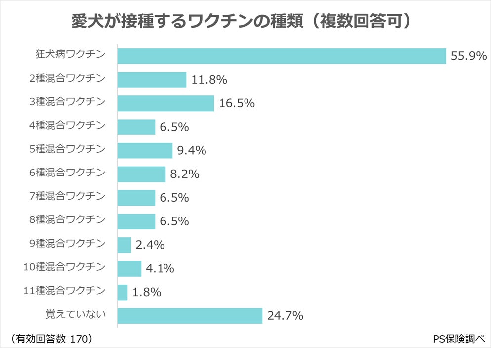その結果、「狂犬病ワクチン」(55.9%)が最多で、法律で義務付けられているため、高い割合を占めています。次いで、「覚えていない」(24.7%)という回答で、飼い主が具体的な接種ワクチンの種類を把握していないケースも少なくないことがわかりました。そのほか、「3種混合ワクチン」(16.5%)や「2種混合ワクチン」(11.8%)が多く、「5種混合ワクチン」(9.4%)や「6種混合ワクチン」(8.2%)も一定数見られました。