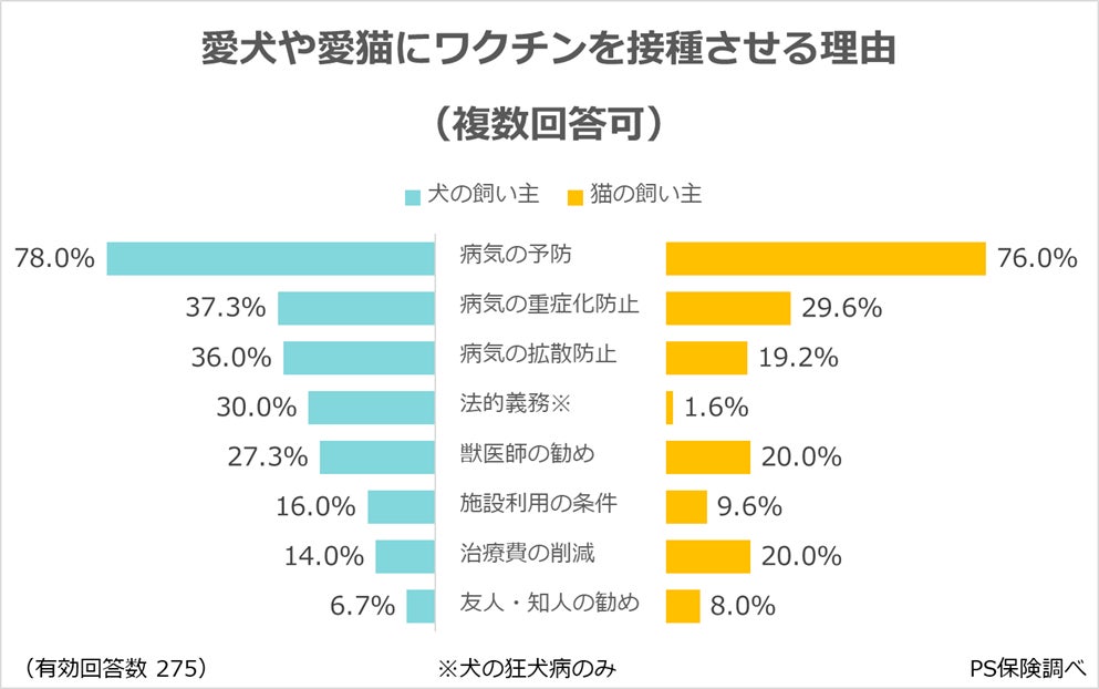 ・飼い主が愛犬や愛猫にワクチン接種をする理由は、「病気の予防」が最多(犬78.0%、猫76.0%)。「病気の重症化防止」や「獣医師の勧め」が続く。