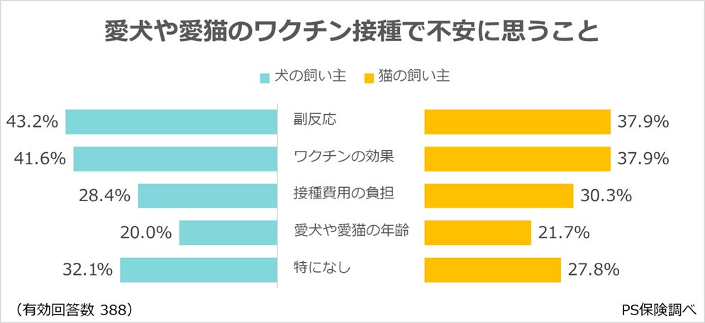 ・愛犬や愛猫のワクチン接種で不安に思うことは、「副反応」(犬43.2%、猫37.9%)と「ワクチンの効果」(犬41.6%、猫37.9%)が上位を占める。