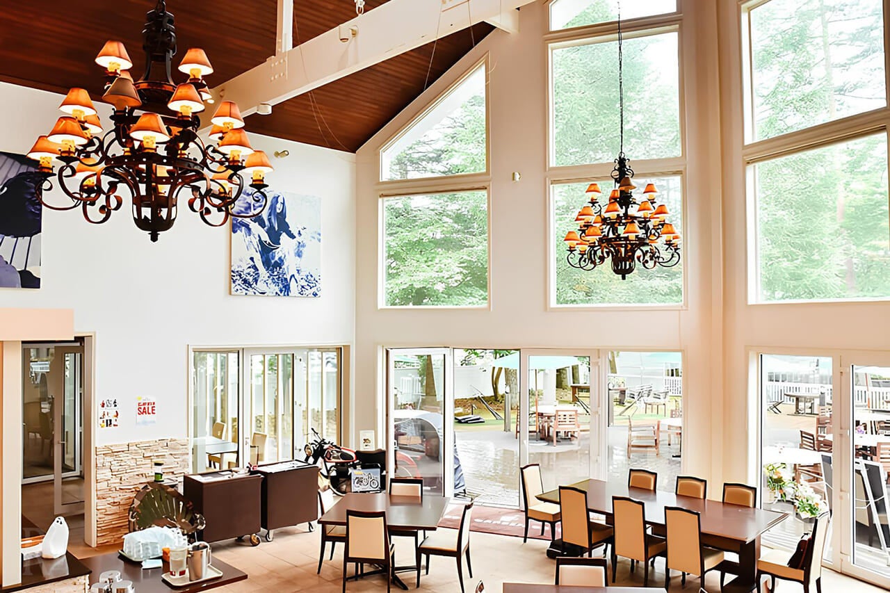 ご宿泊中のお食事は、併設のカフェ&レストランにてお楽しみいただけます。吹き抜けの開放感あふれる店内では、軽井沢産の新鮮な食材をふんだんに使用した多彩なメニューをお楽しみいただけます。