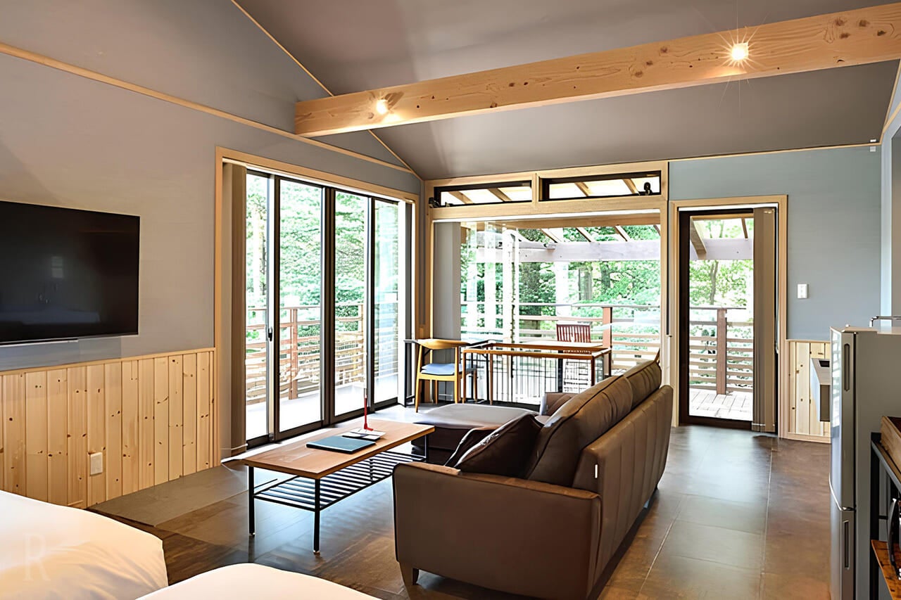 各棟には異なるテーマカラーが設定され、客室は個性的なインテリアでコーディネートされています。全室角部屋で、1階の客室にはウッドチップを敷き詰めたプライベートドッグランを完備。2階の客室にはバルコニーを備え、軽井沢の新鮮な空気を感じながら愛犬と共にゆったりとした時間を過ごせます。