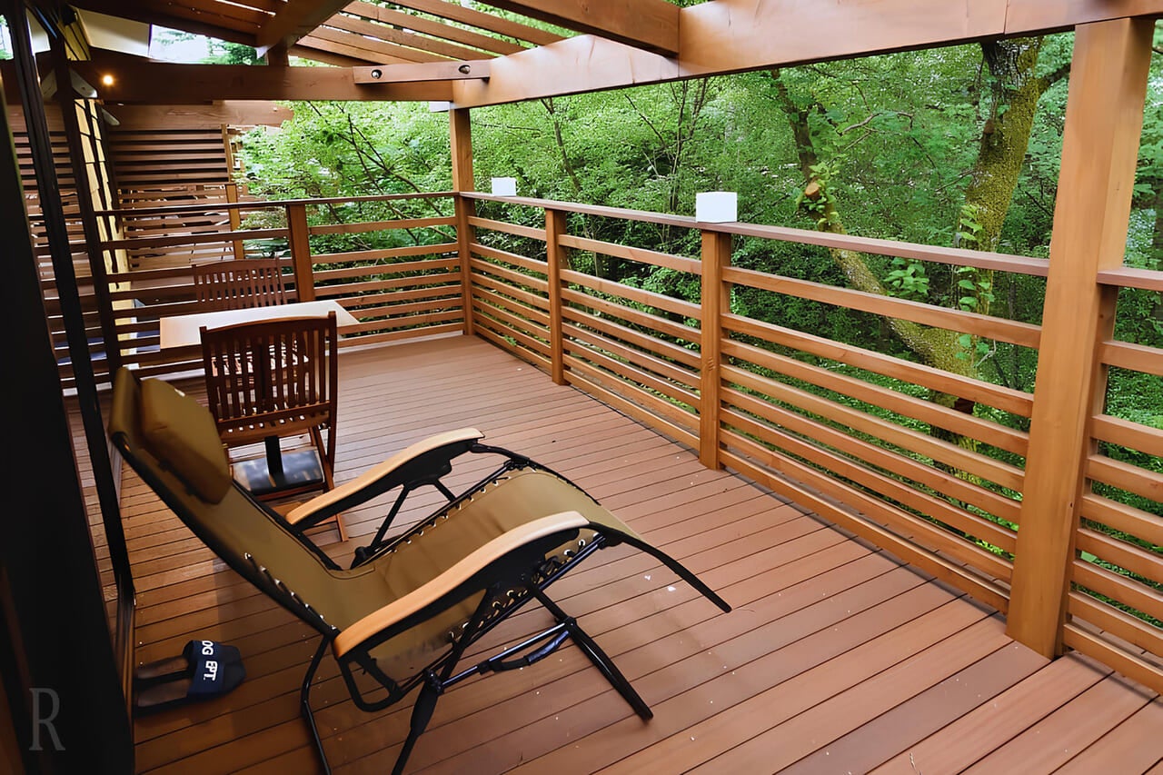 「THE DOG DEPT GARDEN HOTEL 軽井沢テラス」は、隣の部屋との距離が十分に保たれているため、周りに気兼ねなく愛犬と贅沢なひとときをお楽しみいただけます。全室に広々としたテラスが完備され、1階客室はウッドチップのドッグランとテラス付き。2階のテラスは、ワンちゃんが遊べる広いスペースが特徴です。