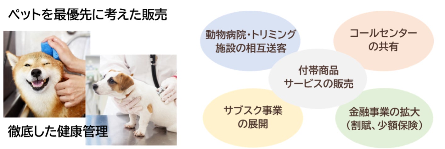 加えて、動物病院、トリミングサロン、ペットホテルといった付帯施設についても相互に活用し合うことで、周辺事業への送客を強化し、利便性のさらなる向上を目指します。コールセンター機能も両社で共有することで、業務効率の向上と迅速かつ丁寧な顧客対応を両立し、より高品質なサービスの提供に努めてまいります。