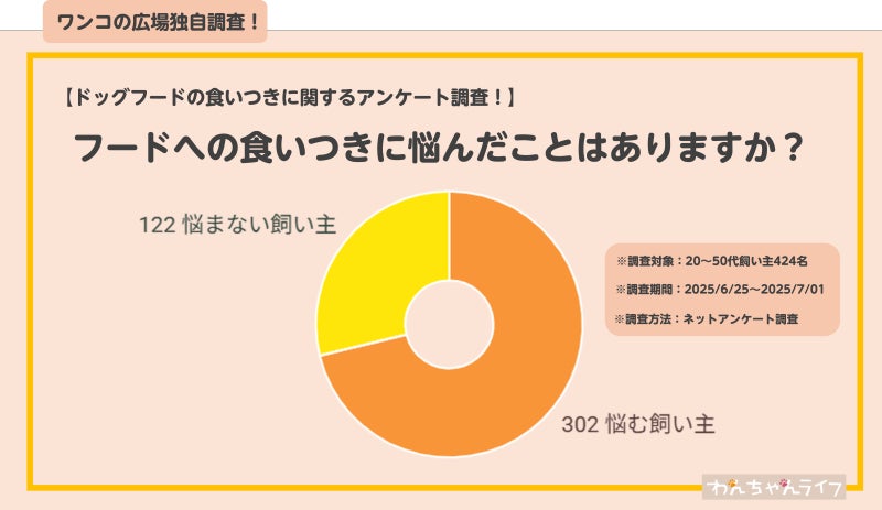 飼い主424名を対象に「フードへの食いつきに悩んだことがあるか」を調査したところ下記の結果になりました。