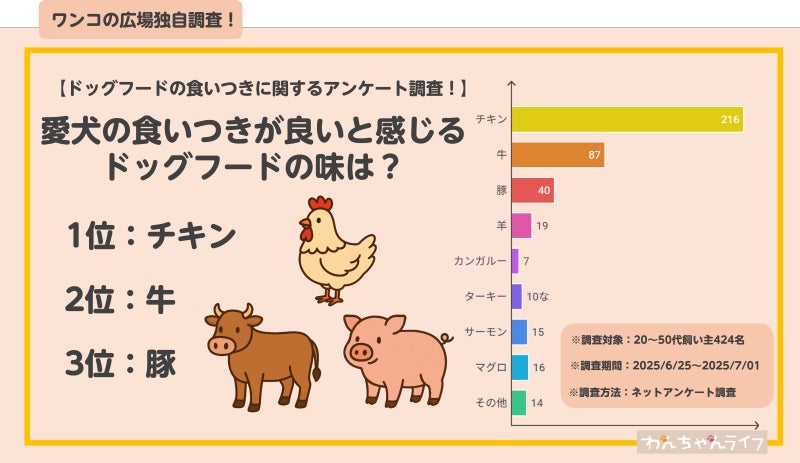 結果、ワンちゃんはチキン味・風味のドッグフードへの食いつきが良いことが判明しました。