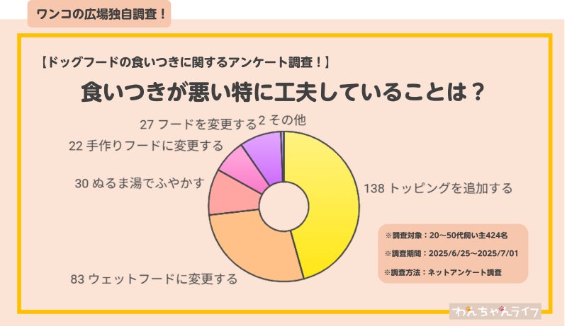 飼い主のお悩みで毎回上位にランクインするのが「ドッグフードの食いつきの悪さ」です。ご飯をバクバクと食べてくれないと心配になる飼い主も多いと思います。そこで実際飼い主にアンケート調査を行いどのようにして食いつきの悪さを解決しているのか調査を行いました。