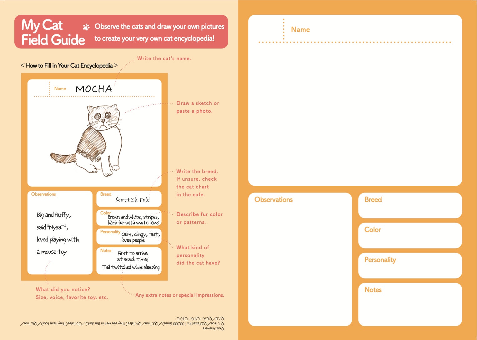 店内でお気に入りの猫を見つけ、見た目や毛色、しぐさ、性格など、気づいたことを自由に書き込んでいきます。