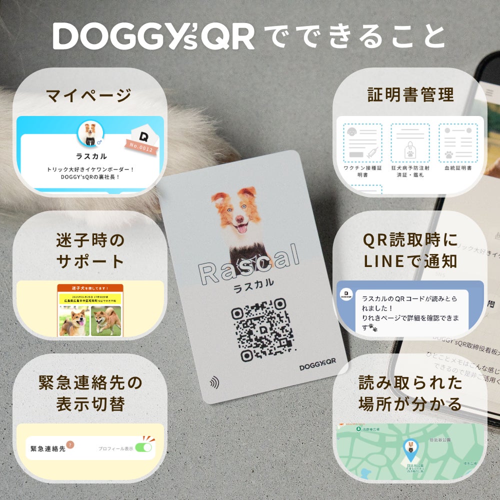 DOGGY’sQRは、QRコードを搭載したスマート迷子札で、「LINE通知」「緊急連絡先の表示切り替え」「証明書管理」「多頭飼い対応」「家族で見守り」など、飼い主に嬉しい機能が充実。