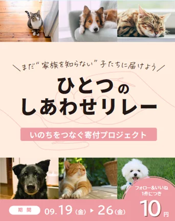 Instagram上での「フォロー」と「いいね」という小さなアクションが、動物保護活動への寄付につながり、“しあわせのリレー”として次のバトンへとつながっていきます。飼い主さまや応援者の想いを結び付け、ペットと人、そして社会全体へと広げていく仕組みです。
