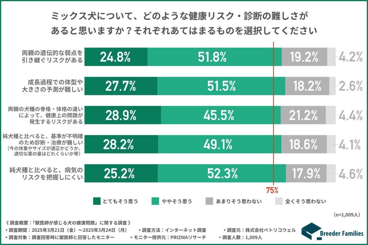 今回と2024年11月の調査から、獣医師の75%以上がミックス犬の健康上の課題を懸念している一方で飼い主の約8割がそのリスクを十分に把握していないという認識のギャップが明らかになりました。