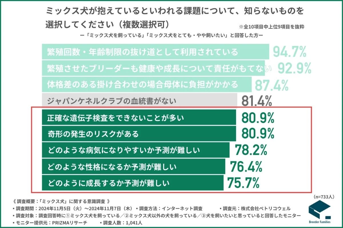 また、2024年11月に行った「ミックス犬」に関する意識調査では、約8割の飼い主がミックス犬の健康リスクを把握していないという結果となっており、専門家である獣医師と飼い主の間に深い認識ギャップが存在することが浮き彫りになりました。