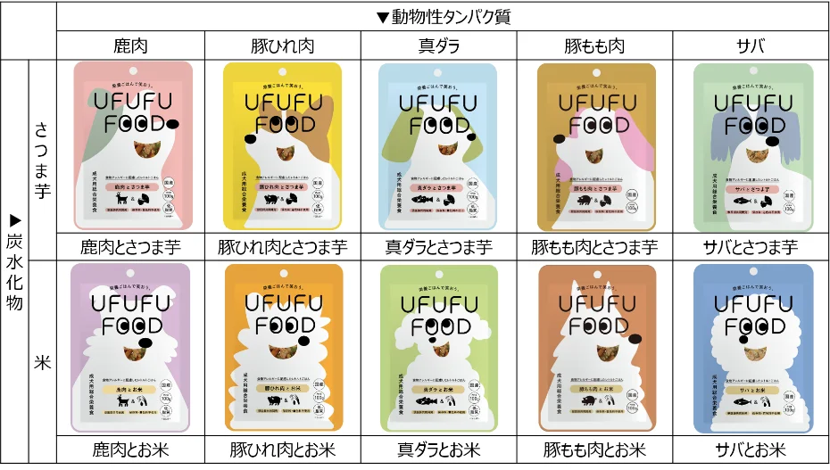 こうした中、当社社員が新規事業創出プログラム「X-Dream」※で提案・採用されたのが、「UFUFU FOOD」です。提案者・獣医師・管理栄養士・ペット栄養管理士がタッグを組み、手づくり品質と“ヒューマングレード”の国産食材にこだわって開発した、ウェットタイプのドッグフードです。愛犬のアレルゲンを特定しやすいよう、1商品につき1種類の動物性タンパク質を使用しており、5種類の動物性タンパク質と2種類の炭水化物を組み合わせた、全10種のメニューをラインナップしました。価格は1個あたり798円(税込)で、公式ECサイトや雑貨館インキューブ、西鉄ストアなどで販売します。食物アレルギーの有無にかかわらず、安心して食べていただける「UFUFU FOOD」をぜひお試しください。
